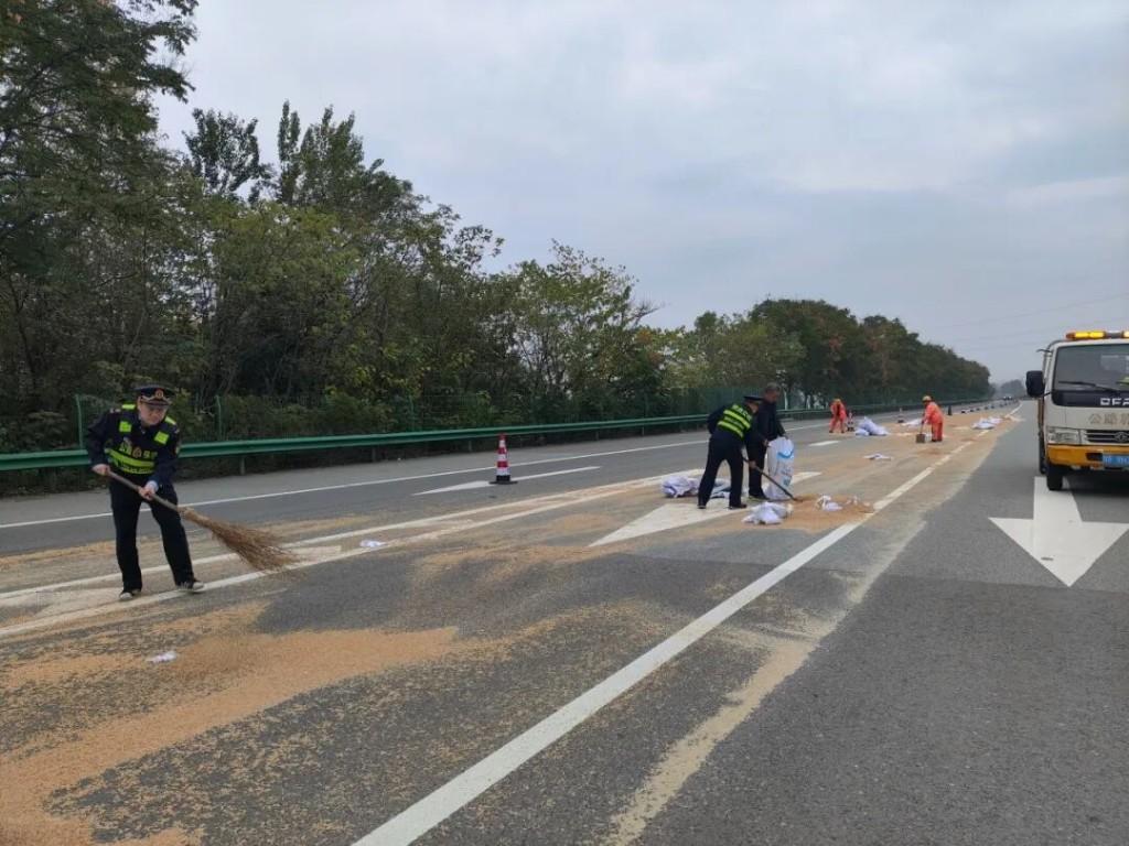 经过90分钟的紧张作业,洒落的10吨稻谷被全部清理完毕,路面也恢复了整洁。交通也随之恢复正常通行,过往车辆有序地驶过事发路段。