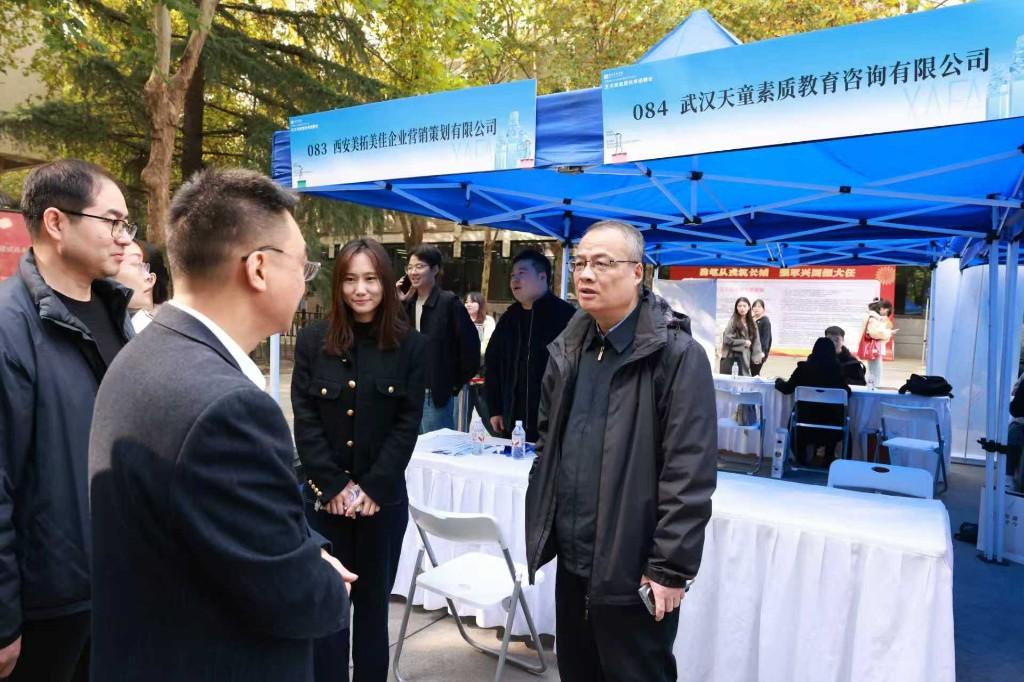 招聘会现场,西安美术学院党委书记丁巨涛、院长朱尽晖、党委副书记邱必震与用人单位及毕业生进行亲切交流。丁巨涛在详细了解了本次招聘会情况后,强调要以招聘会为重要纽带,与企业深化产学研合作,共同培养符合产业需求的高素质人才。朱尽晖深入了解了“政策咨询”“AI简历”、应征入伍宣传等特色服务区,与企业代表、学生多次互动交流,指出学校要及时跟企业进行对接,了解企业需求,将需求反馈给教学;要将就业教育引导工作前置,把职业生涯指导贯穿育人全过程。