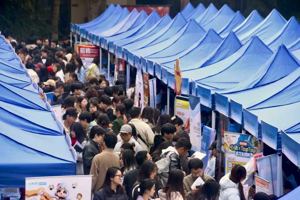 招聘会现场设置考公考编、西部计划政策咨询、应征入伍、AI简历优化等专业化咨询服务区;同时为鼓励学生创新创业,设置创艺市集专区,设有近百个摊位,创意产品涵盖多个领域。