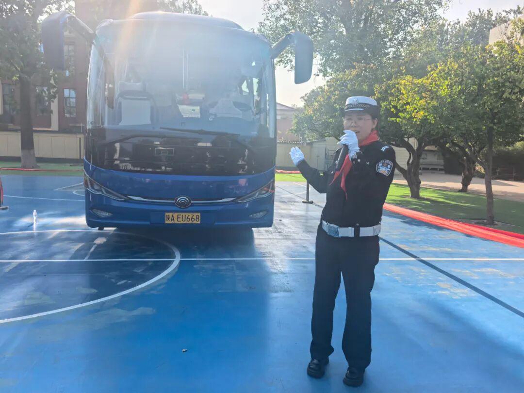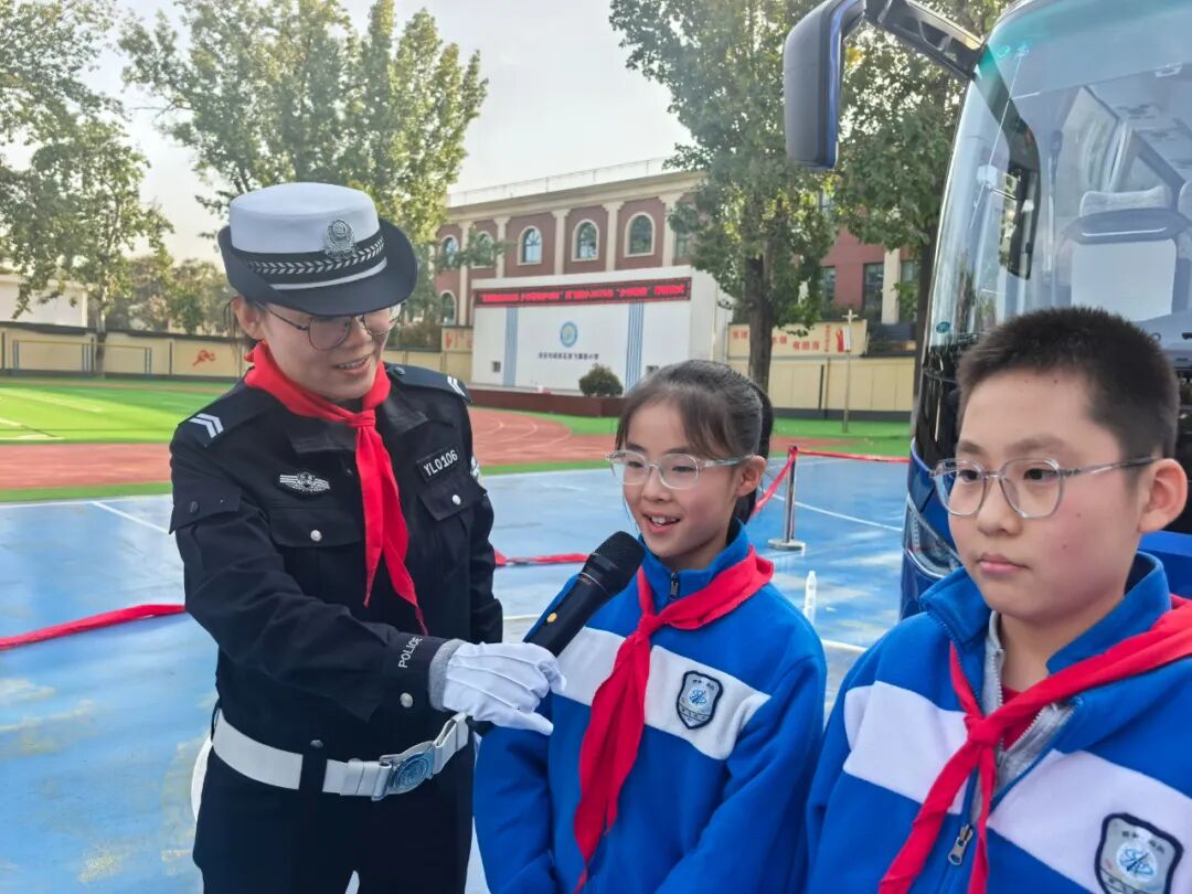 开营仪式后,大队安监中队交警李棉带来的大客车盲区演示课,用生动直观的方式为孩子们敲响了安全警钟。孩子们围着大客车,通过亲身体验,深刻理解了"知危险 会避险"的重要性。
