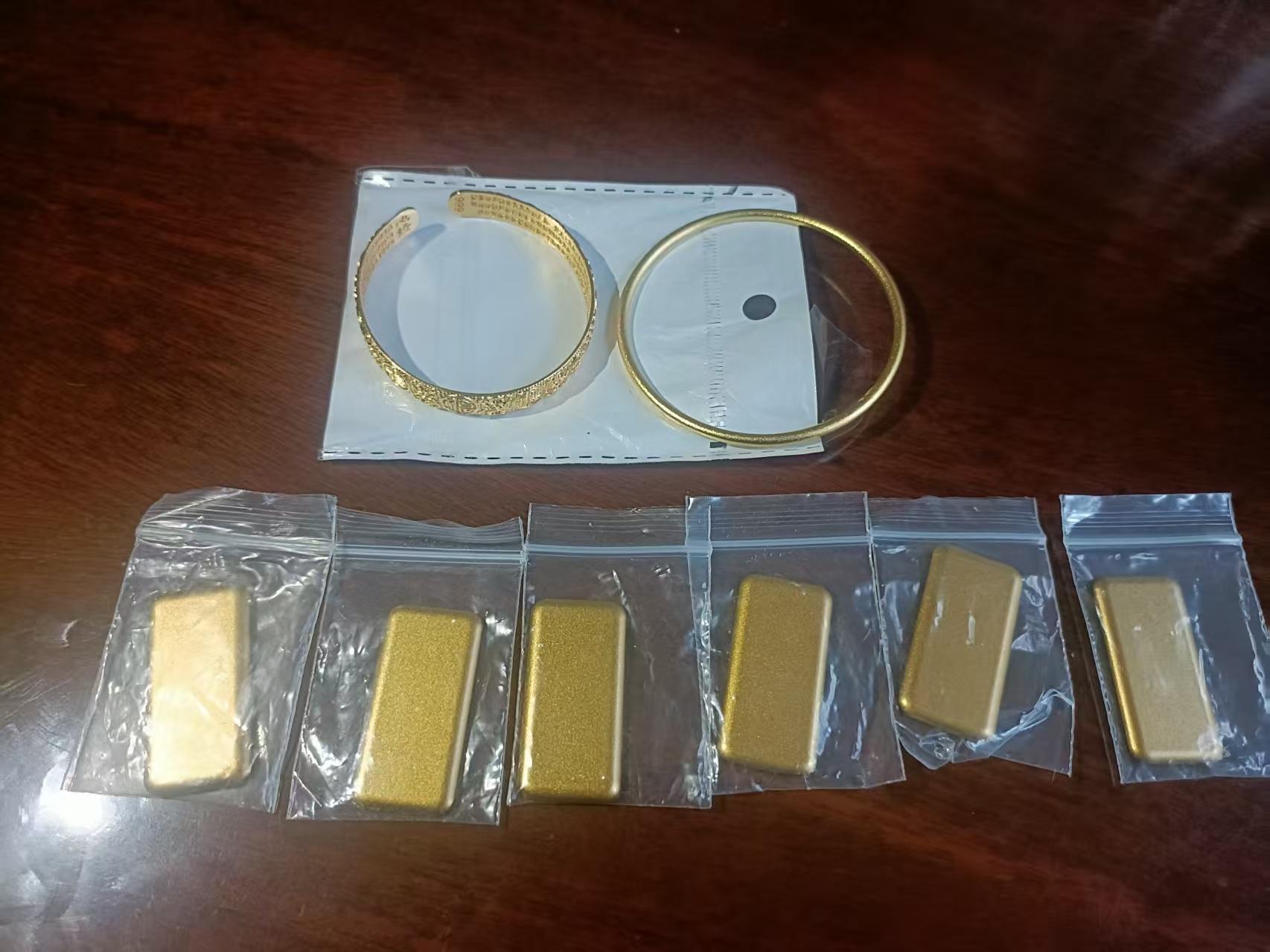 两人没有就此放弃,继续仔细检查。当拿起黑色小钱包时,明显感觉分量沉甸甸的。打开钱包,里面除了多张票据外,还藏着一个普通塑料袋。轻轻展开塑料袋,2只金镯子与6块金条金灿灿的格外显眼。