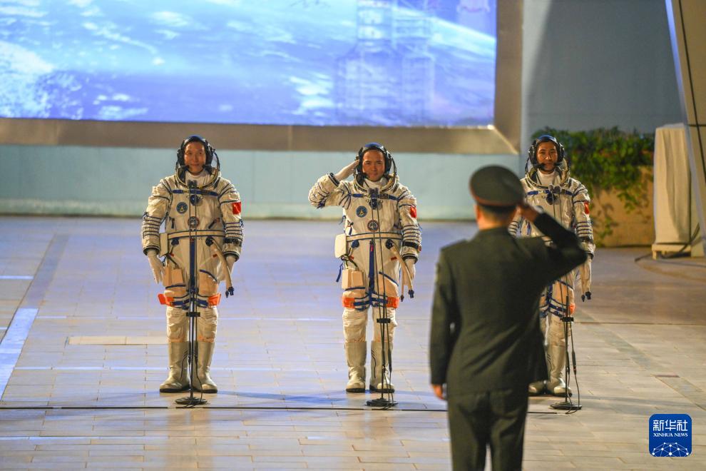 10月31日晚,神舟二十一号载人飞行任务航天员乘组出征仪式在酒泉卫星发射中心问天阁圆梦园广场举行。这是航天员张陆(中)、武飞(右)、张洪章在出征仪式上。