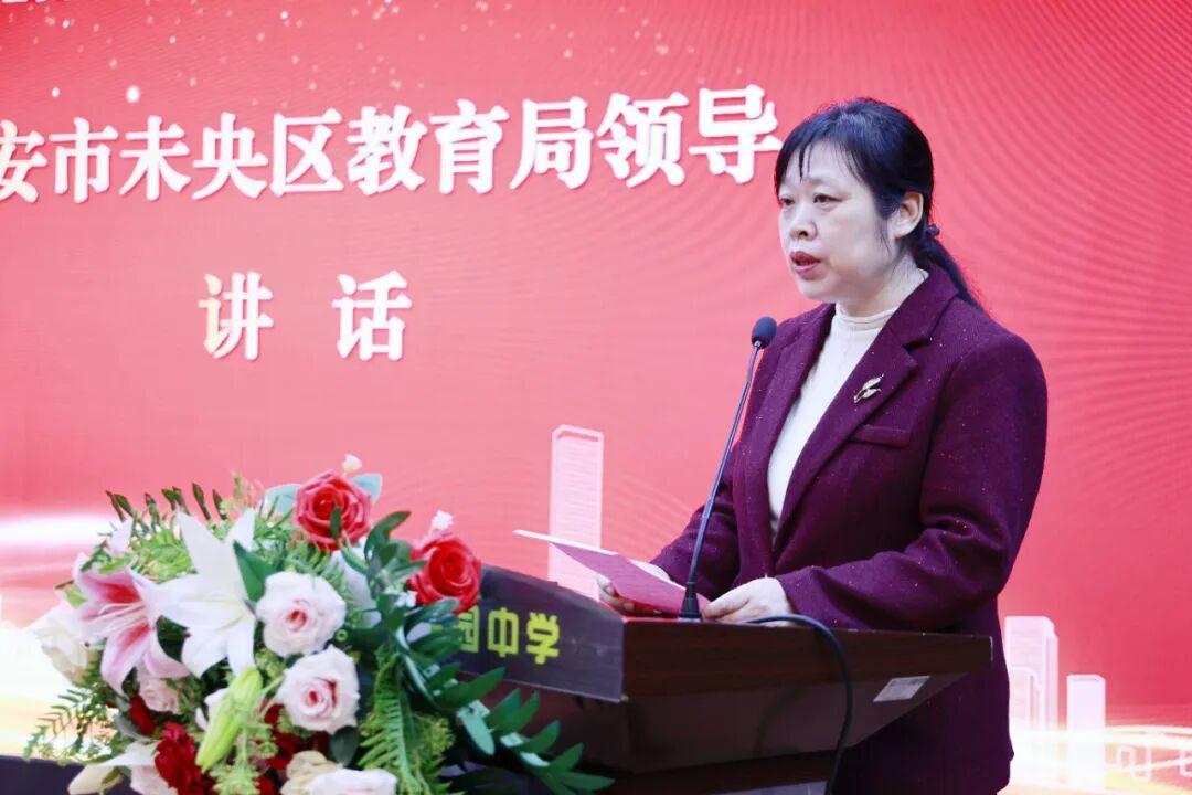 未央区教育局徐灵科长发表致辞。她谈到,中小学心理健康工作是事关千万家庭幸福和国家未来的基础性工程,未央教育局始终将学生的心理健康教育提在优先发展的战略位置,她充分肯定了锦园中学在心理健康教育,特别是AI在心理健康教育实践方面取得的显著成果,并将其誉为“未央教育的一张暖心名片”。徐科长强调:“将AI技术和积极心理学融入日常教学与管理,不是增加负担,而是为教育‘提质增效’。教育局将大力支持各校开展此类探索,从‘关注问题’转向‘培植优势’,让每一个孩子都能阳光向上。”