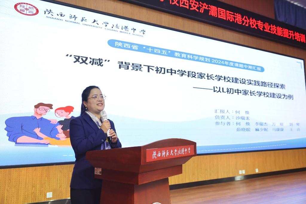 该校心理教师、浐灞国际港“名师+”研修共同体主持人何焕,就陕西省教育科学规划课题《“双减”背景下初中学段家长学校建设实践路径探索——以L初中家长学校建设为例》,系统汇报了该校“寒晖”家长学校的中期实践成果。
