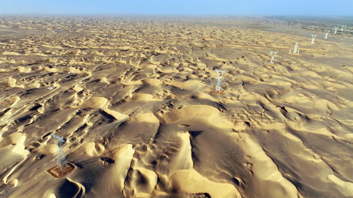 2025年6月25日,民丰—且末—若羌750千伏输电线路工程穿越“死亡之海”塔克拉玛干沙漠。(马元 摄)