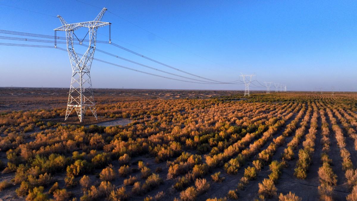2025年10月18日,民丰—且末—若羌750千伏输电线路工程与胡杨林和谐共处。(马元 摄)