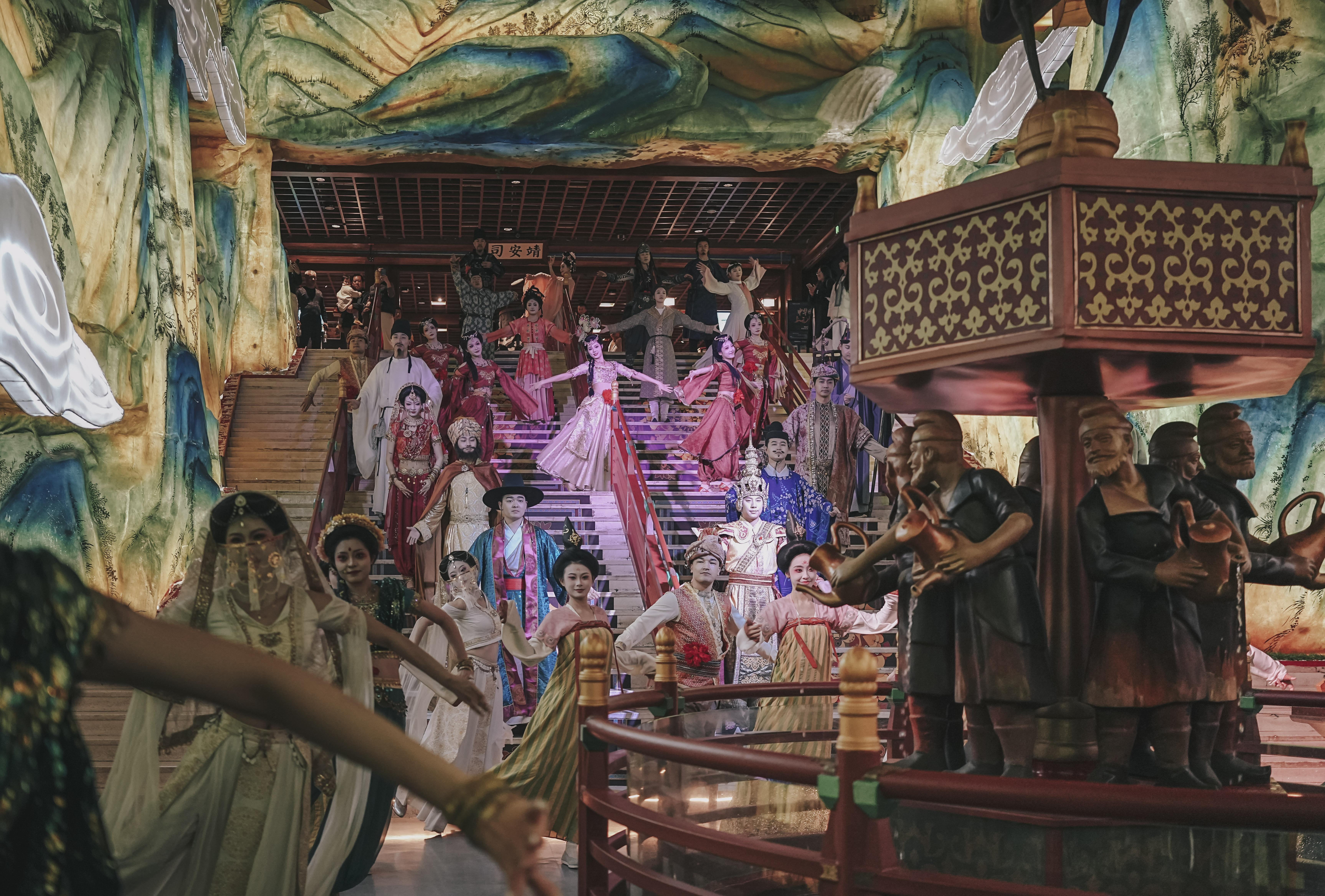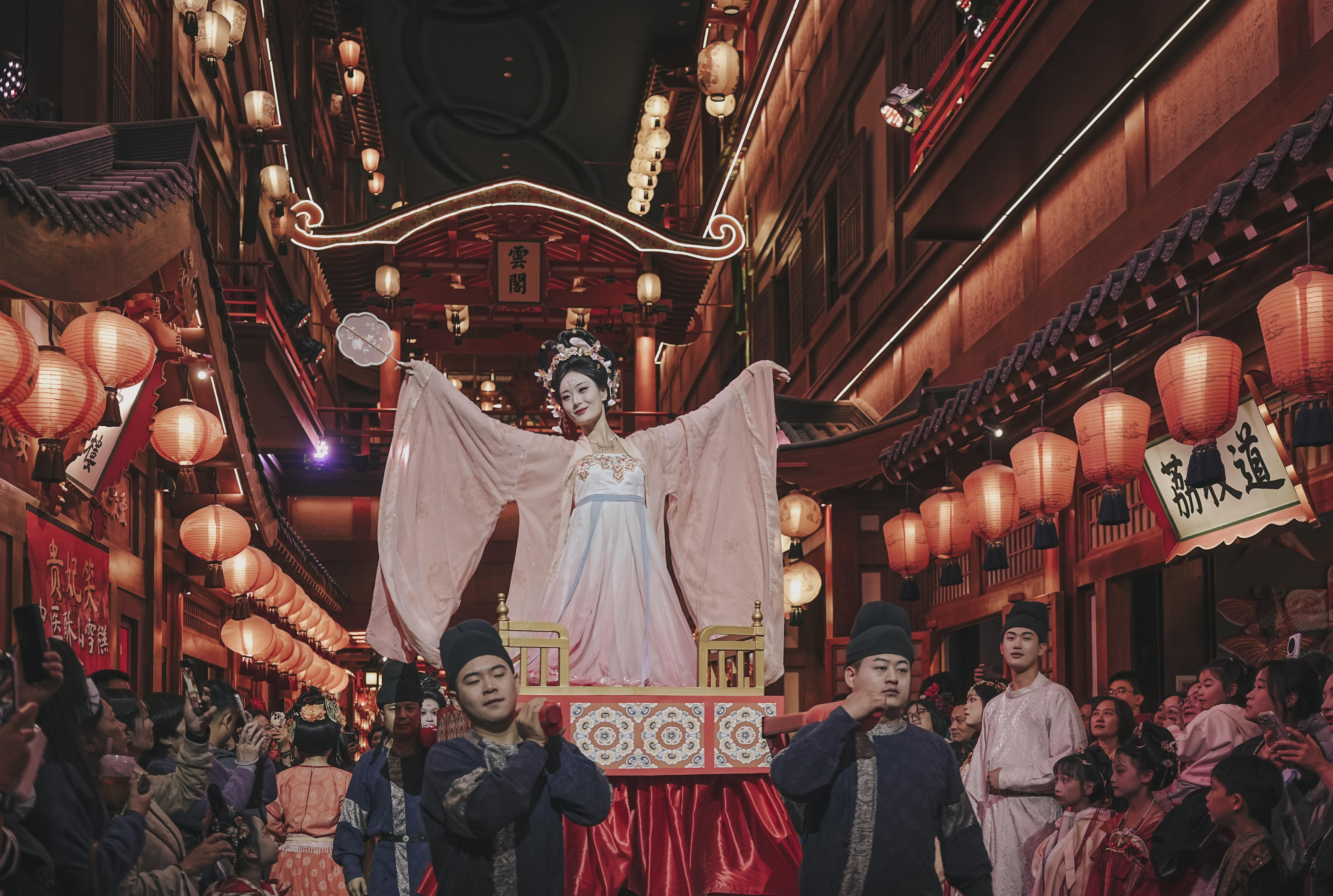 在沉浸式演艺方面,街区花萼相辉楼推出《唐宫乐舞》特色演出,身着圆领袍的大唐乐师们演奏碰铃、笙笛、编钟等盛唐乐器,高髻罗裙的仕女们伴随悠扬的宫廷乐曲蹁跹起舞,打造沉浸式视听体验。行走在街区,游客还能体验“花魁巡游”“柳教习授礼”等现场互动。红龙仙山处还设有融合剧、乐、舞的鲜活表演,让游客近距离感受盛唐文化。