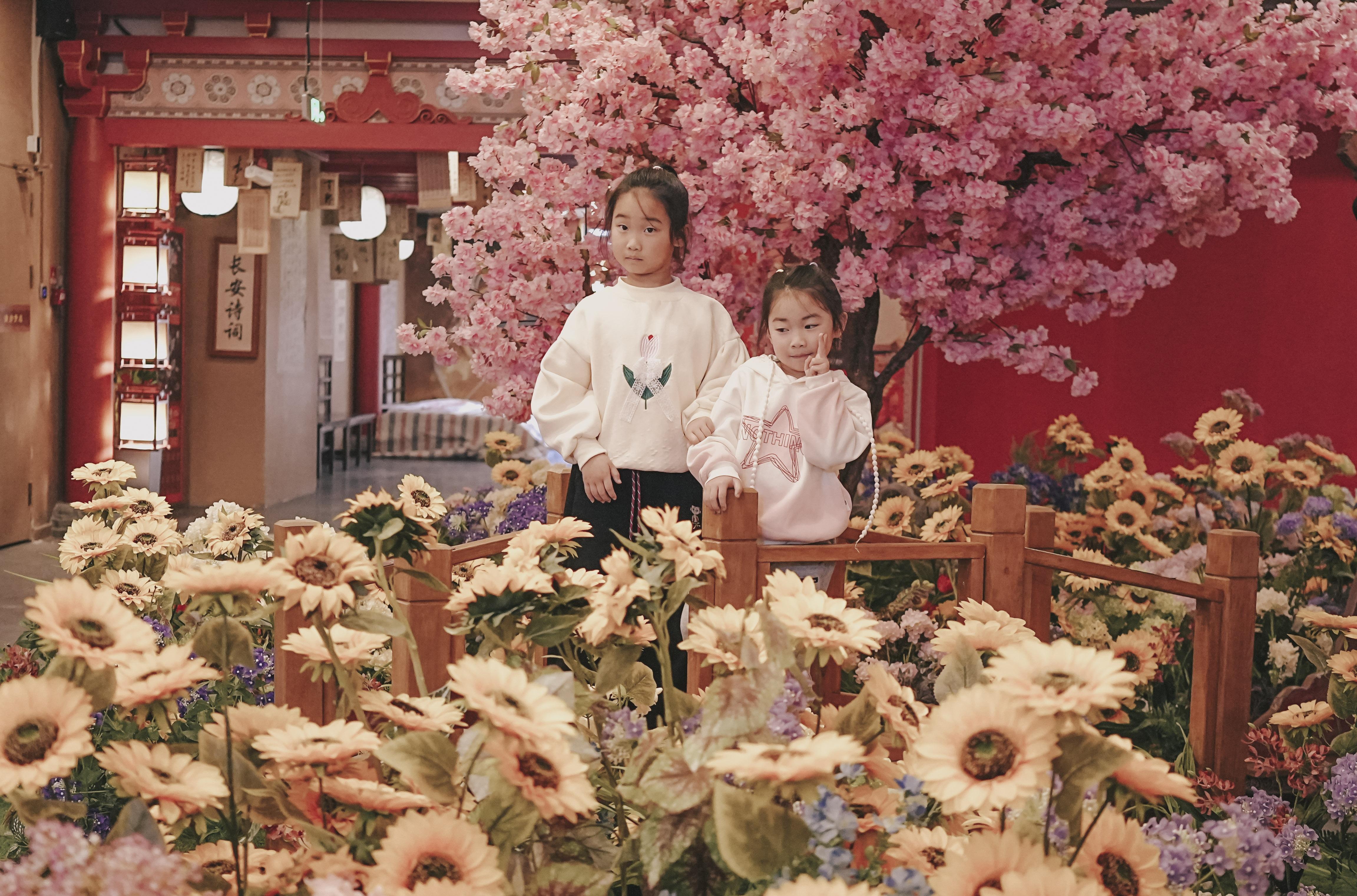 场景打造上,街区中庭还原了唐代名画《虢国夫人游春图》的意境。桃树成荫、拱桥静立,花团锦簇的海棠、向日葵与巧笑倩兮的仕女相映成趣,营造出唐代园林的雅致意趣,成为游客打卡热点。据悉,街区游客换装率达七成以上。开业三年来,街区沉浸式场景带动周边新增汉服店500余家,汉服租赁、妆造服务、专业跟拍等业态形成特色“汉服经济”生态圈,实现文化传承与经济发展的共赢局面。