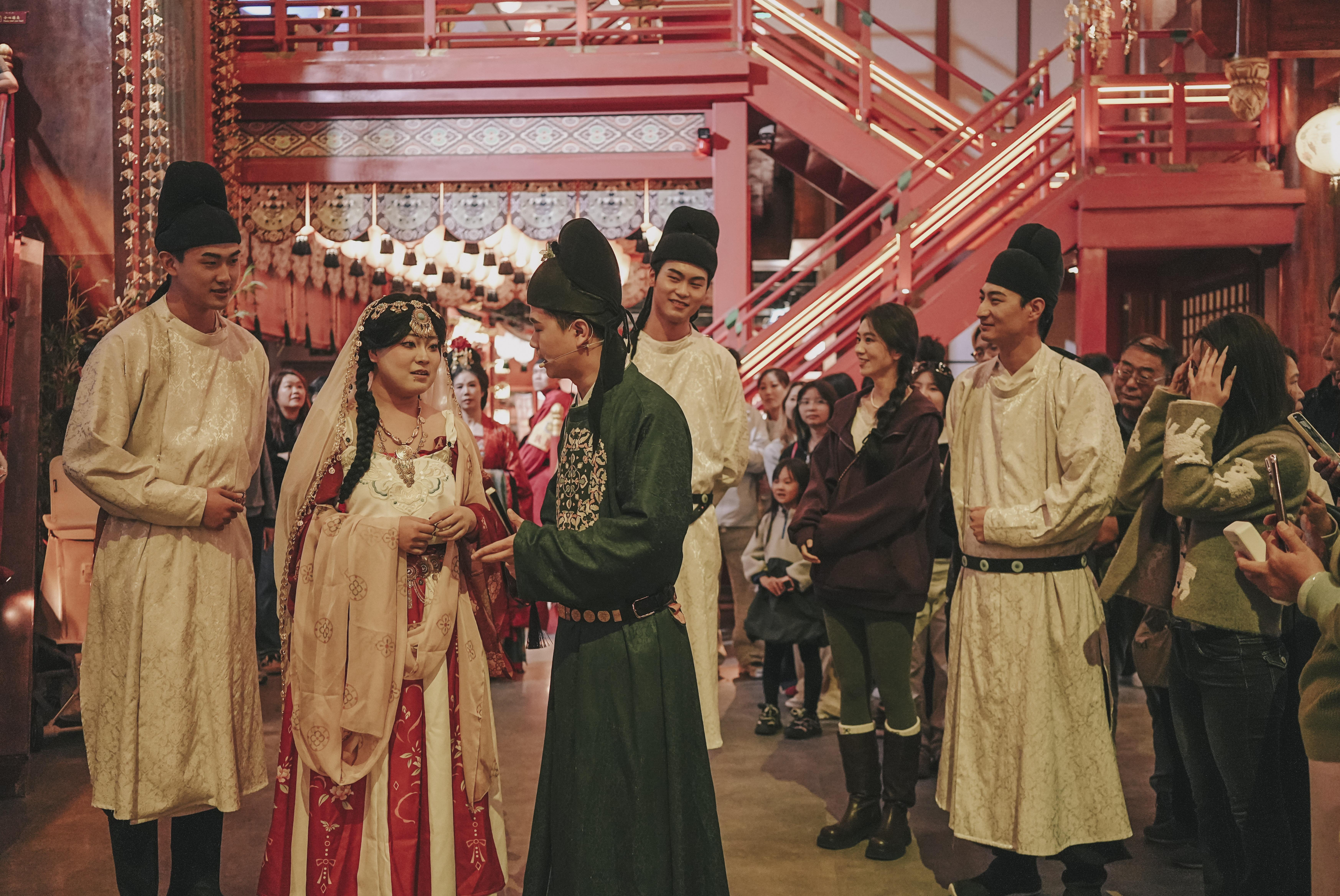 全域互动环节同样亮点纷呈。挑着扁担的游商沿街叫卖,用地道长安话与游客互动。“王维”与游客吟诗作对,“孙思邈”的药摊开展辨药识草活动,投壶、蹴鞠等传统游戏区人气高涨。沉浸式游戏《大唐永不眠》新增的剧情线吸引众多“老粉”前来打卡,游客可凭借互动赢取的“银票”兑换唐风文创品。不同身份、不同故事的NPC角色与游客高频互动,将他们带入盛唐的璀璨历史中,推动游客从“观光者”转向“参与者”,沉浸式体验拉满。