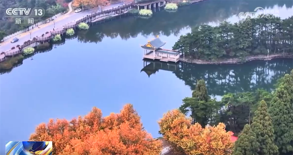 11月的庐山,秋色渐浓,风景如画。高空俯瞰,如琴湖畔,梧桐叶黄、鸡爪槭红。山雾随风而起,半遮半掩,色彩斑斓的秋天景色若隐若现,倒映在湖中如梦如幻。众多游客纷至沓来,登山赏景,打卡留念。