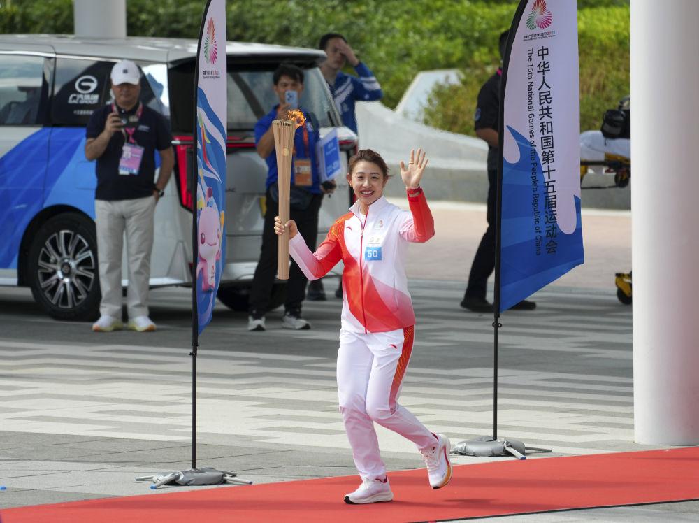 ↑ 火炬手何超琼在火炬传递活动中。新华社记者 那宇奇 摄