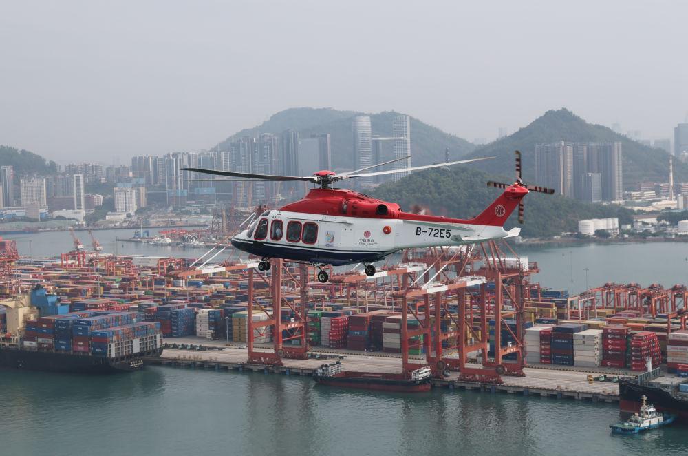 ↑ 搭载圣火的直升机进行空中传递。新华社记者 梁旭 摄