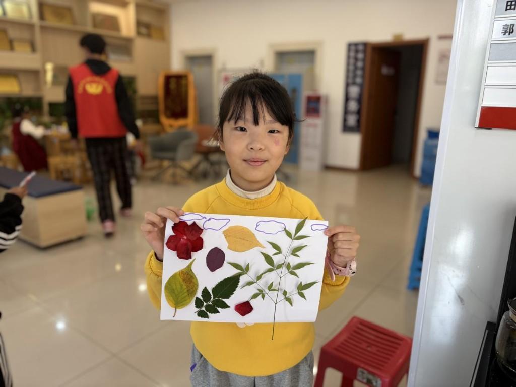 活动还巧妙融入传统文化与自然教育。孩子们在志愿者带领下走进社区绿地,拾取秋叶,学习物候知识,了解节气与自然的关系。随后,他们将落叶变成艺术素材,制作出一幅幅富有创意的树叶贴画,在动手实践中感知四季更迭之美。