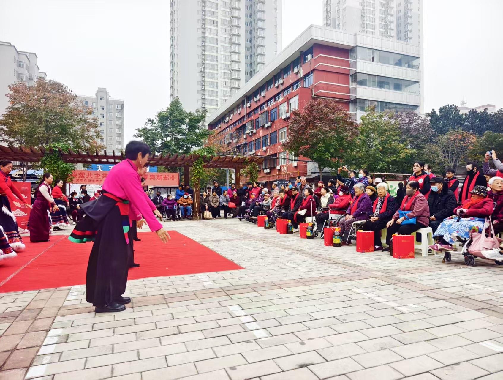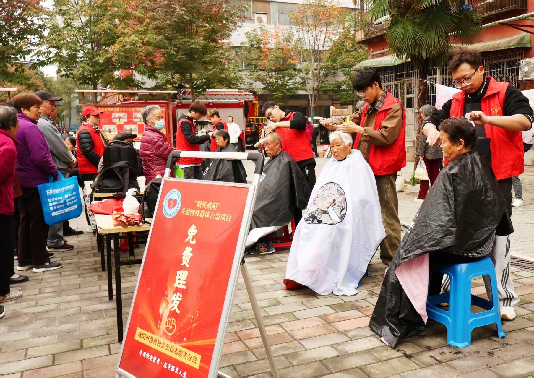 随后的文艺汇演将现场氛围推向高潮。咸阳信天游文化促进协会火车头秧歌队带来热闹表演,欢快的旋律、灵动的舞姿引得老人们阵阵掌声;广场另一侧,各类服务同样火热—陕中二附院与兔博士口腔门诊的医护人员耐心为老人问诊、检查口腔,细致解答健康疑问;秦都区消防便民服务队队员忙着向老人普及居家防火知识;西安康博尔艺术技师学院的志愿者发挥专业所长,为老人提供义剪服务;咸阳市政务服务中心的志愿者则为老人讲解政策及政务办理流程,或协助布置现场,或陪老人唠家常。身着统一马甲、佩戴证件的志愿者,成为现场最亮眼的“志愿红”。