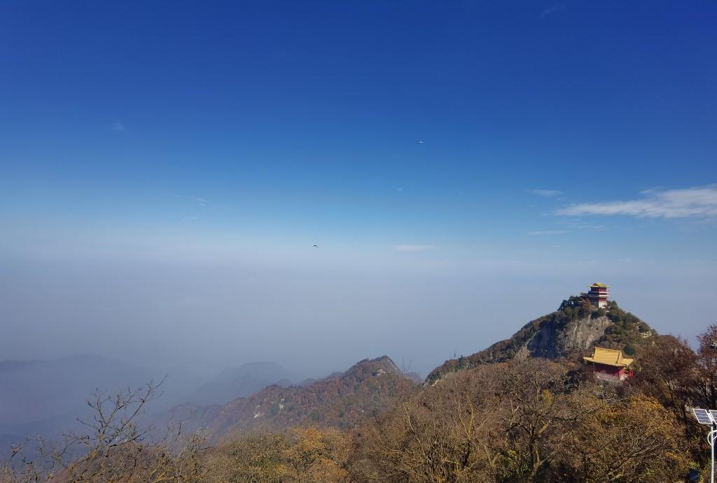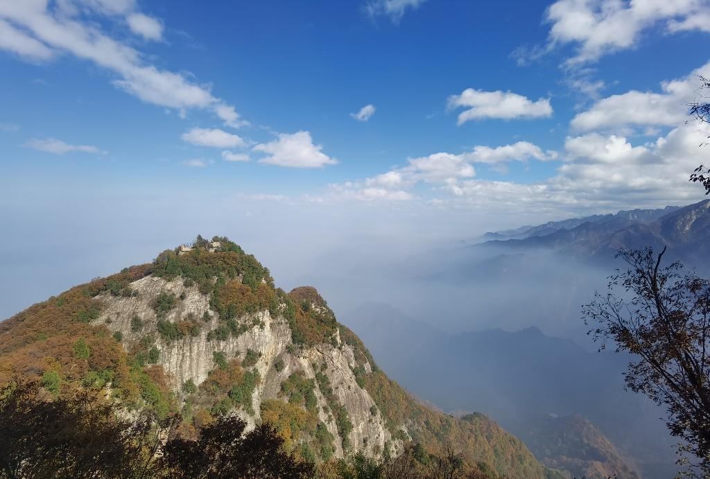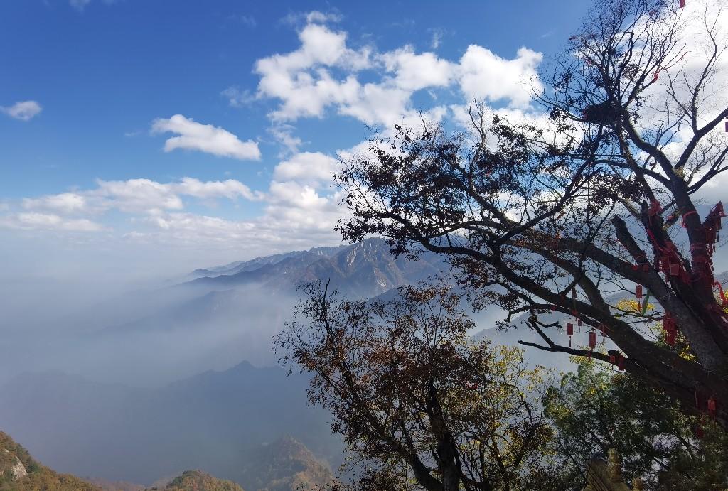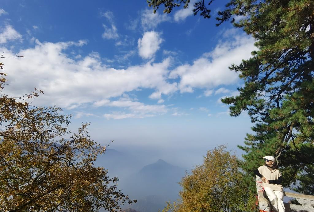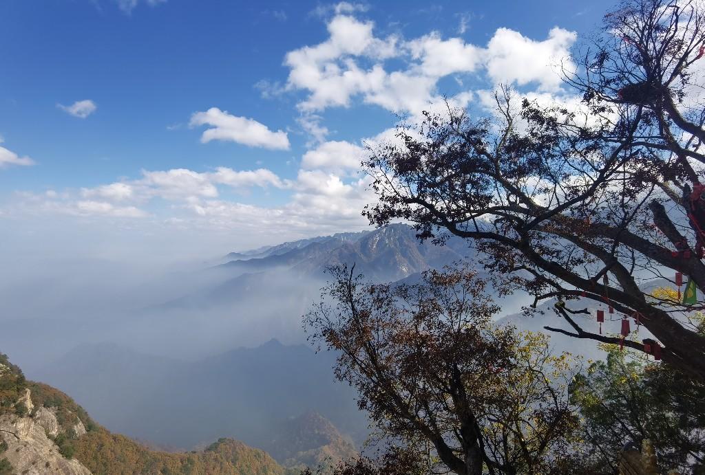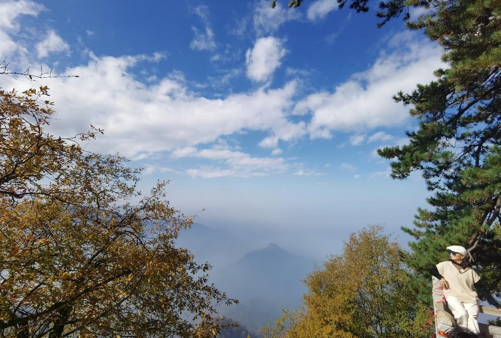 顺着景区生态步道拾级而上,百年古松柏与漫山红叶交织,呈现出大自然巧夺天工的中式美学。登临南五台,极目远眺,秦岭秋色尽收眼底。漫山遍野的红叶似烈焰燃烧,黄叶如鎏金铺展,与点缀其间的古寺建筑、蜿蜒山道共同构成了一幅壮丽的山水长卷,尽展“太乙近天都,连山接海隅”的诗中意境。