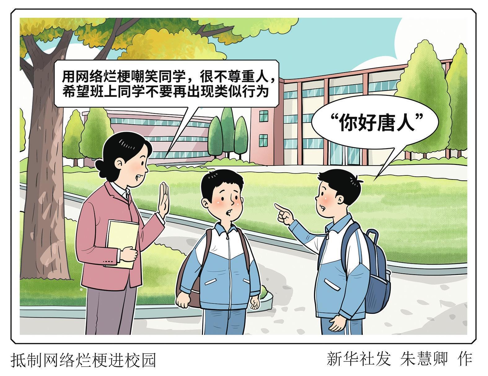 前不久,重庆一名初中老师在社交平台上发布抵制网络烂梗进校园的视频,引发广泛关注。这位教师在视频中称,班上有学生用“唐人”“你好唐人”等网络烂梗嘲笑同学,这种行为实在不妥,很不尊重人,希望班上同学不要再出现类似行为。