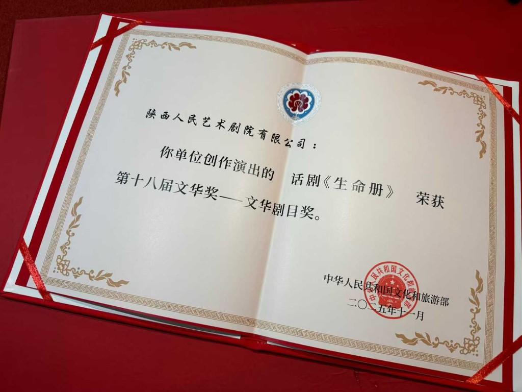 三秦都市报-三秦网讯(记者 夏明勤)11月4日晚,由文化和旅游部、重庆市人民政府、四川省人民政府共同主办的第十四届中国艺术节在重庆圆满落下帷幕。闭幕式上,备受瞩目的第十八届文华奖评选结果揭晓。由陕西省文化和旅游厅推荐、陕西演艺集团·陕西人民艺术剧院有限公司出品的话剧《生命册》荣获“文华剧目奖”。