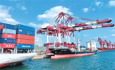 十月二十九日,直达韩国仁川港的“泛奥升奥普轮”(右)在青岛港前湾港区装卸集装箱(无人机照片)。