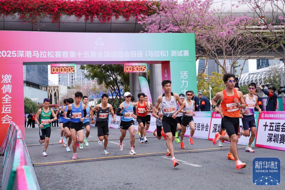 ↑在2025深港马拉松赛暨第十五届全国运动会田径(马拉松)测试赛中,男子组参赛运动员从起点出发(2025年2月23日摄)。新华社记者 梁旭 摄