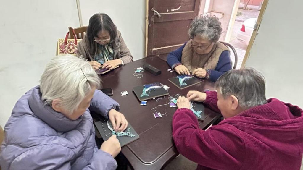 实践环节中,老人们迫不及待地拿起工具,投入创作。她们有的专注缠绕丝线,手指灵巧地在木板图案间穿梭;有的则围坐交流技巧,现场笑声不断。遇到难题时,老人们互相探讨、共同攻克。随着时间推移,一幅幅精美的绕线画逐渐完成,老人们脸上洋溢着自豪与满足的笑容,纷纷举起作品相互欣赏、夸赞。