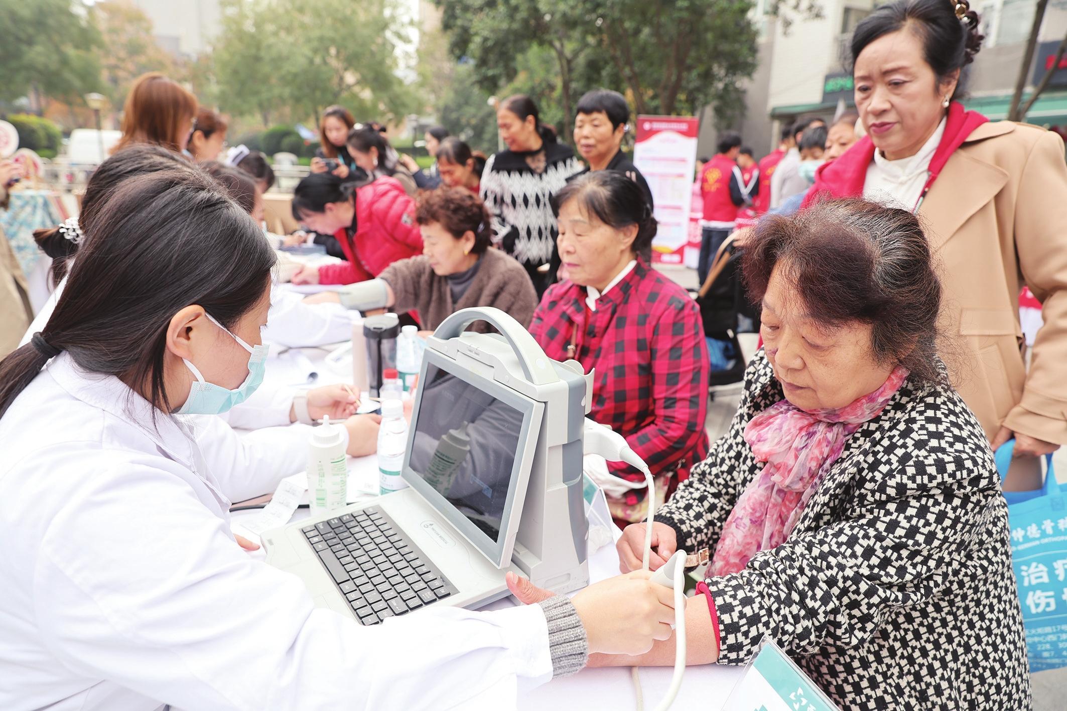 健康服务区前排起了长队,这里是大家最关注的区域之一。美年大健康建国分院的医护人员带着血压仪、血糖仪、干眼雾化器等设备,为居民提供多元化免费健康服务。