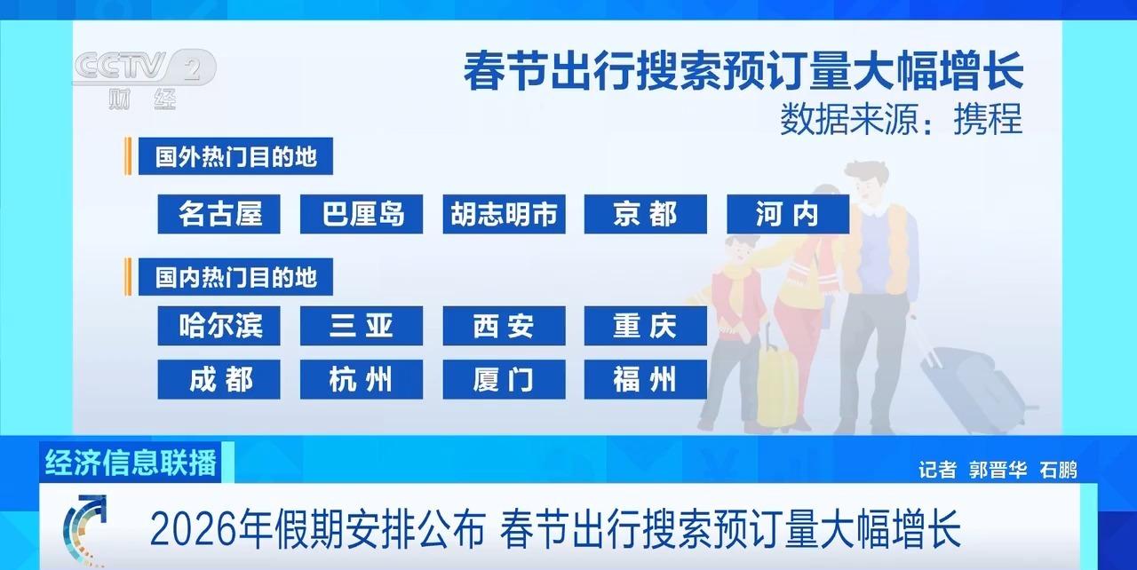11月4日,国务院办公厅发布了《关于2026年部分节假日安排的通知》。其中,春节安排放假9天。记者从多个旅游平台了解到,消息刚刚发布,春节出行旅游的搜索量和预订量就出现快速增长。