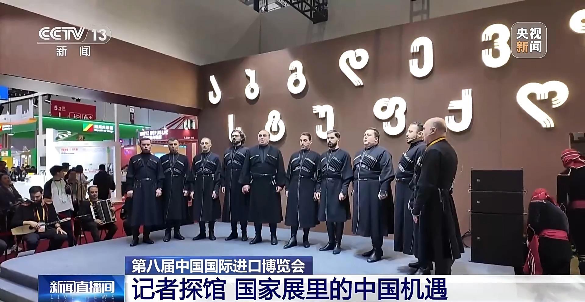 总台央视记者 宋菀:第一个任务结束,接下来我要去寻找最好听的展馆。其实国家展区别于其他展区的一大特点,就是除了商品展示之外,还有很多人文交流活动,不少国家都会带来歌舞表演吸引观众来逛展。您瞧,在格鲁吉亚的展台上,歌手和舞蹈演员正在尽情表演。