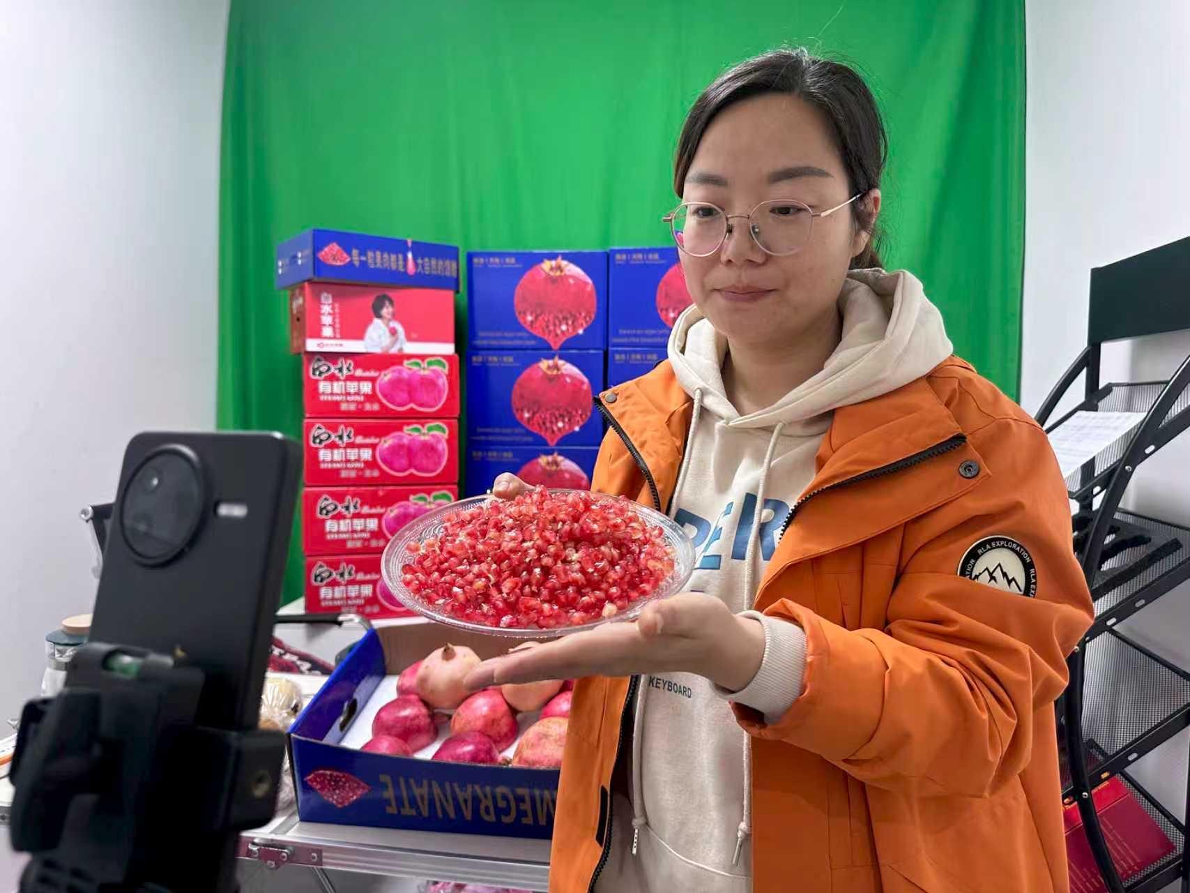 三秦都市报-三秦网讯(胡晓 记者 胡琳)“直播间的家人们,你们看我手里的临潼石榴颗粒饱满,咬一口满嘴爆汁……”11月5日,西安市临潼区电商达人陈维博在直播间里,手持鲜红石榴,热情地向广大网友们介绍临潼石榴的口感、营养价值,演示剥籽技巧。临潼石榴的好评不断“刷屏”,吸引了许多网友下单购买。