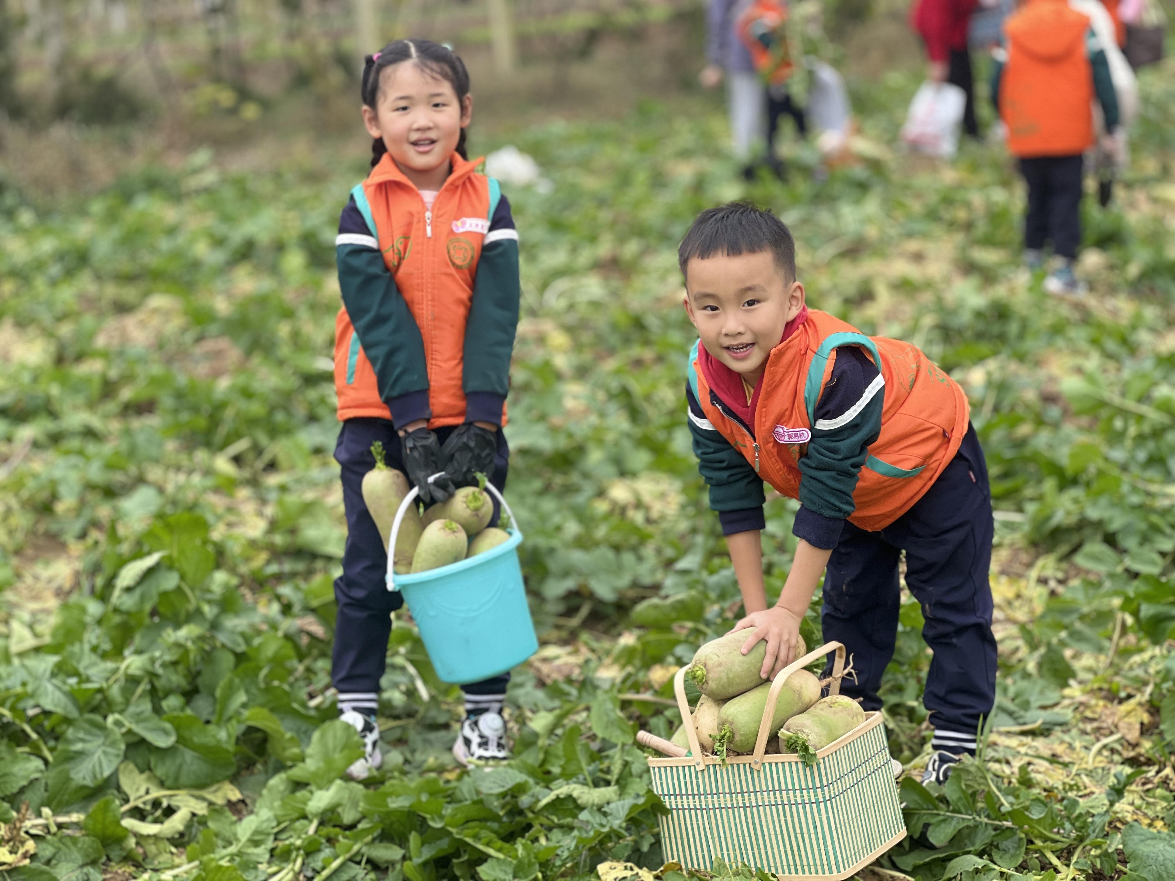 拔完萝卜,孩子们抱着自己的“战利品”,大方地与工作人员沟通,尝试称重、计算、付款……语言表达与钱币认知能力等也在实践中悄然增长。
