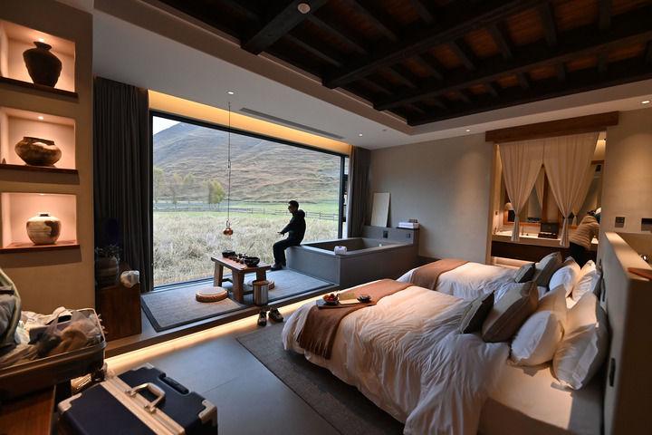 2025年10月31日,在四川省甘孜州康定市新都桥镇,来自浙江的游客在赞巴·明境民宿酒店的房间里休息。新华社记者 肖潇 摄