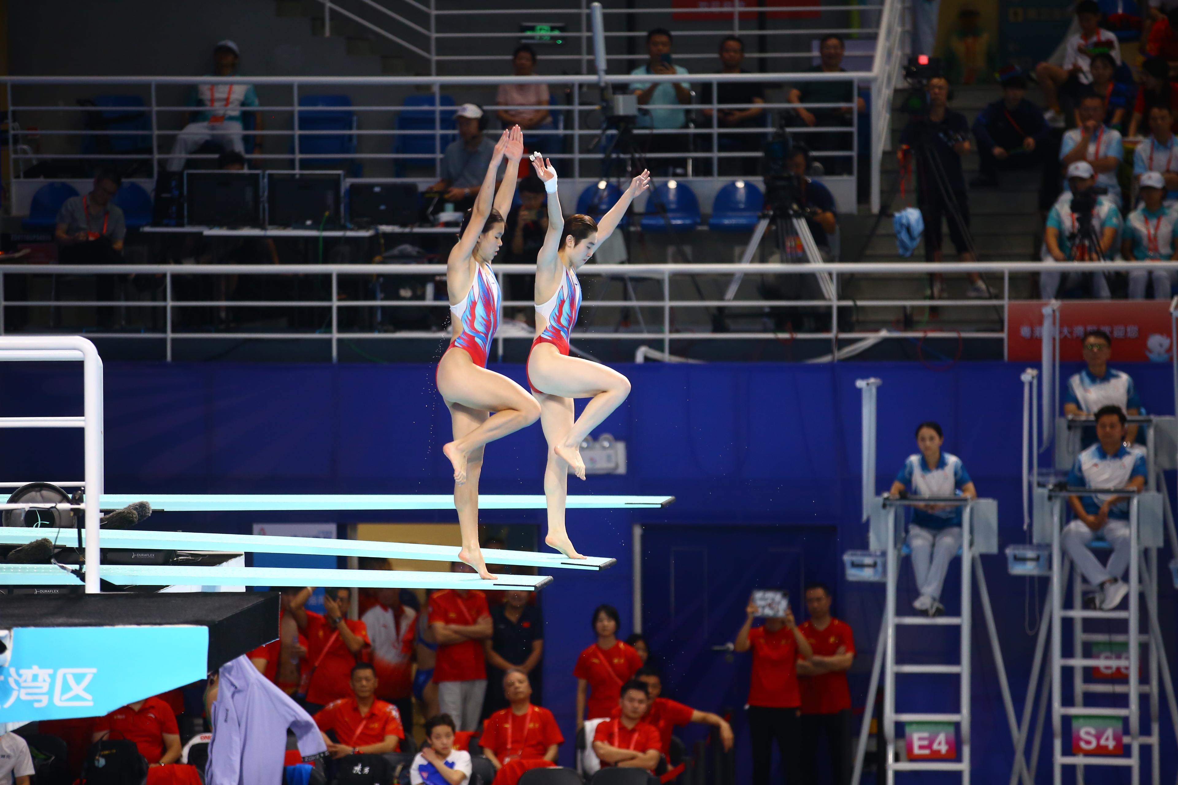 当晚率先开赛的女子双人3米跳板决赛,汇聚国内顶尖选手,堪称一场“巅峰对话”。上午预赛中,司雅杰/龙艺萍便以297.69分位列第二顺利晋级。面对东道主陈艺文/林珊等劲旅的强势围剿,二人全程展现出超乎预期的稳定性,每一轮动作皆力求精准。
