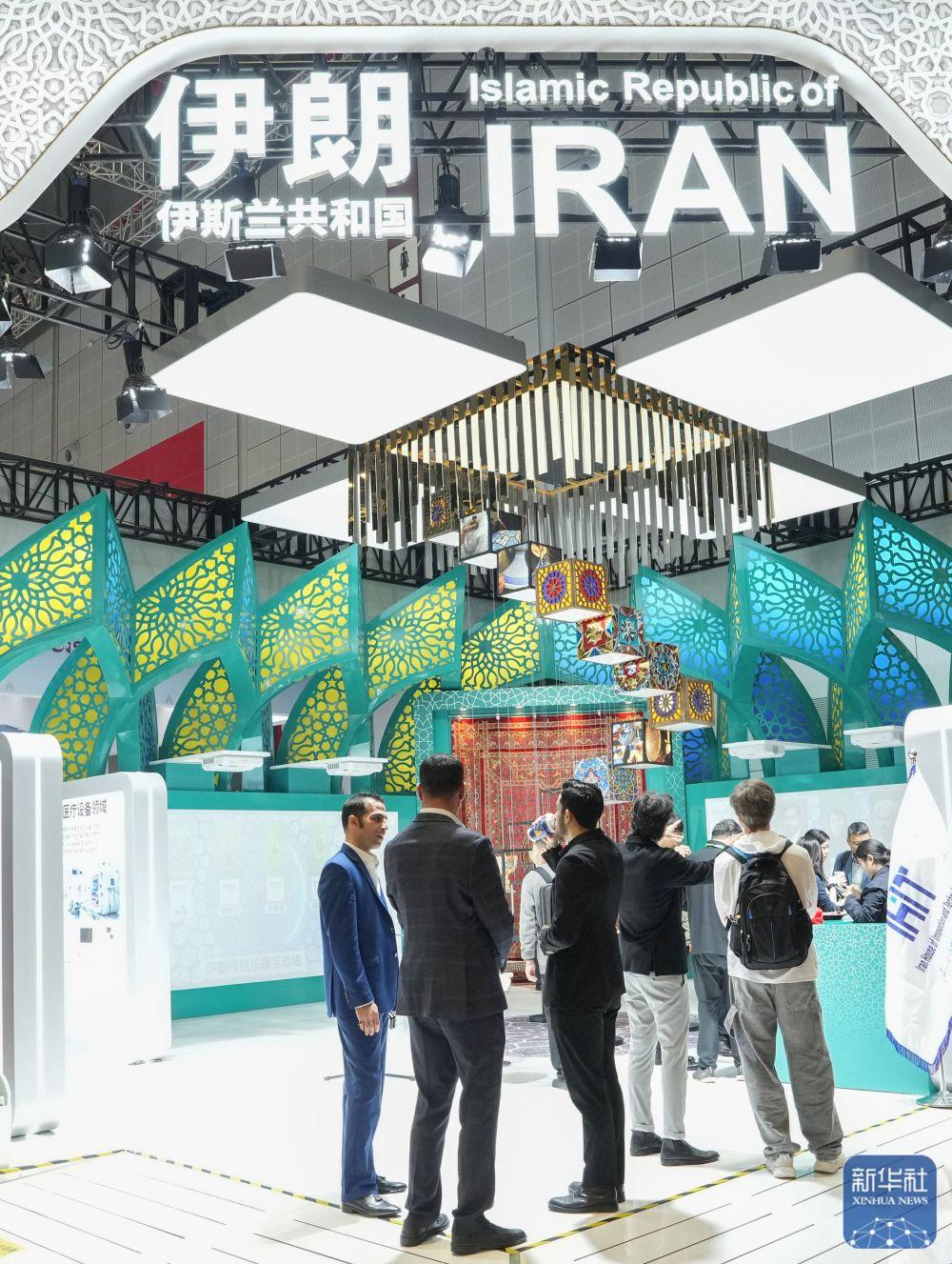 ↑ 11月7日,人们在第八届进博会国家展伊朗馆洽谈。新华社记者 任鹏飞 摄