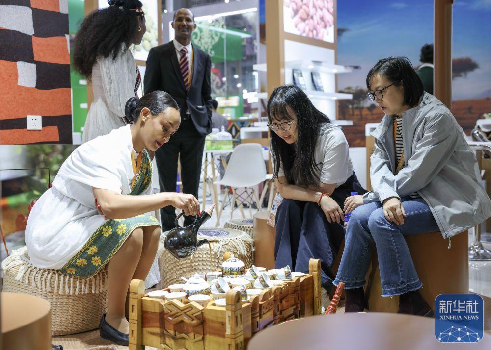 ↑ 11月7日,人们在第八届进博会国家展埃塞俄比亚馆品尝咖啡。新华社记者 孟晨光 摄