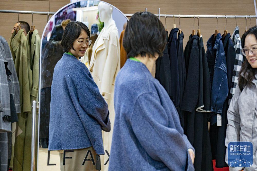 ↑ 11月7日,在第八届进博会消费品展区,参观者试穿产自蒙古国的羊毛外衣。新华社记者 丁赫 摄