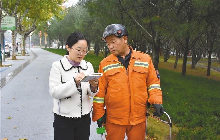 十一月七日,王艳在铜川市新区斯正街采访环卫工人。