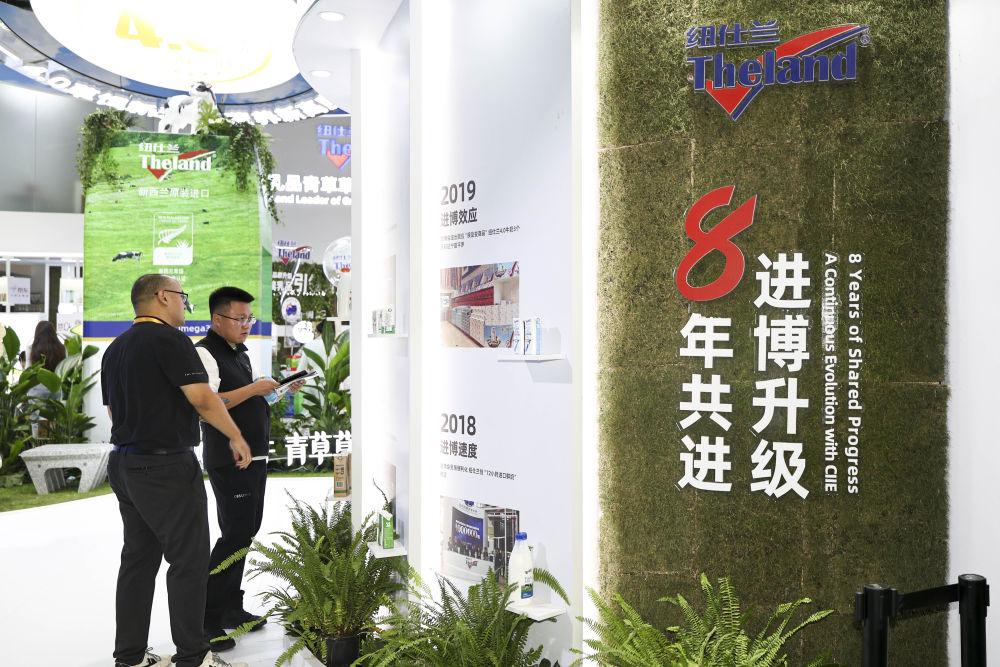 11月7日,展商(左)为参观者介绍来自新西兰的纽仕兰乳制品。新华社记者王翔摄