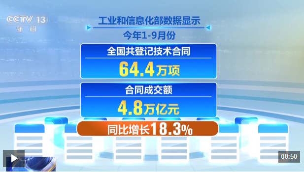 工业和信息化部数据显示,今年1—9月份,全国共登记技术合同64.4万项,合同成交额4.8万亿元,同比增长18.3%。