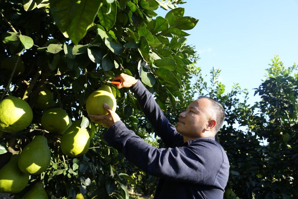 2025年11月7日,柚农在梅州南福金柚种植基地测试柚子甜度。