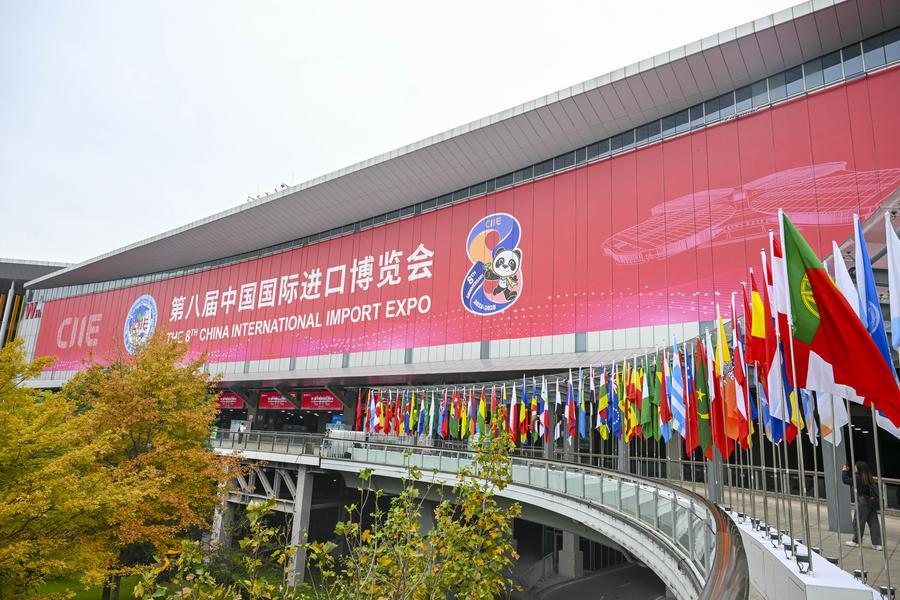 This photo taken on Nov. 4, 2025 shows a view of the National Exhibition and Convention Center (Shanghai), the main venue for the eighth China International Import Expo (CIIE), in east China's Shanghai. (Xinhua/Chen Haoming)