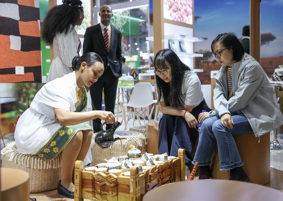 Visitors try coffee at the pavilion of Ethiopia during the eighth China International Import Expo (CIIE) in east China's Shanghai, Nov. 7, 2025. (Xinhua/Meng Chenguang)