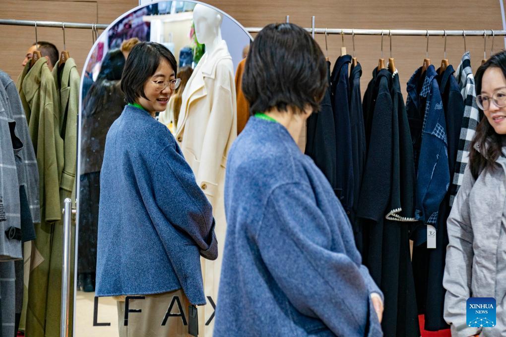 A visitor tries a wool coat from Mongolia at the Consumer Goods exhibition area of the eighth China International Import Expo (CIIE) in east China's Shanghai, Nov. 7, 2025. The eighth CIIE opened here on Wednesday. Enterprises from a total of 123 Belt and Road partner countries participated in this year's CIIE, increasing by 23.1 percent year on year. (Xinhua/Ding He)