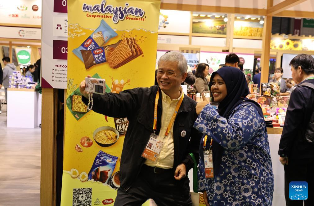 An exhibitor from Singapore (L) takes selfies with an exhibitor from Malaysia at the Food and Agricultural Products exhibition area during the eighth China International Import Expo in east China's Shanghai, Nov. 7, 2025. The eighth CIIE opened here on Wednesday. Enterprises from a total of 123 Belt and Road partner countries participated in this year's CIIE, increasing by 23.1 percent year on year. (Xinhua/Fang Zhe)