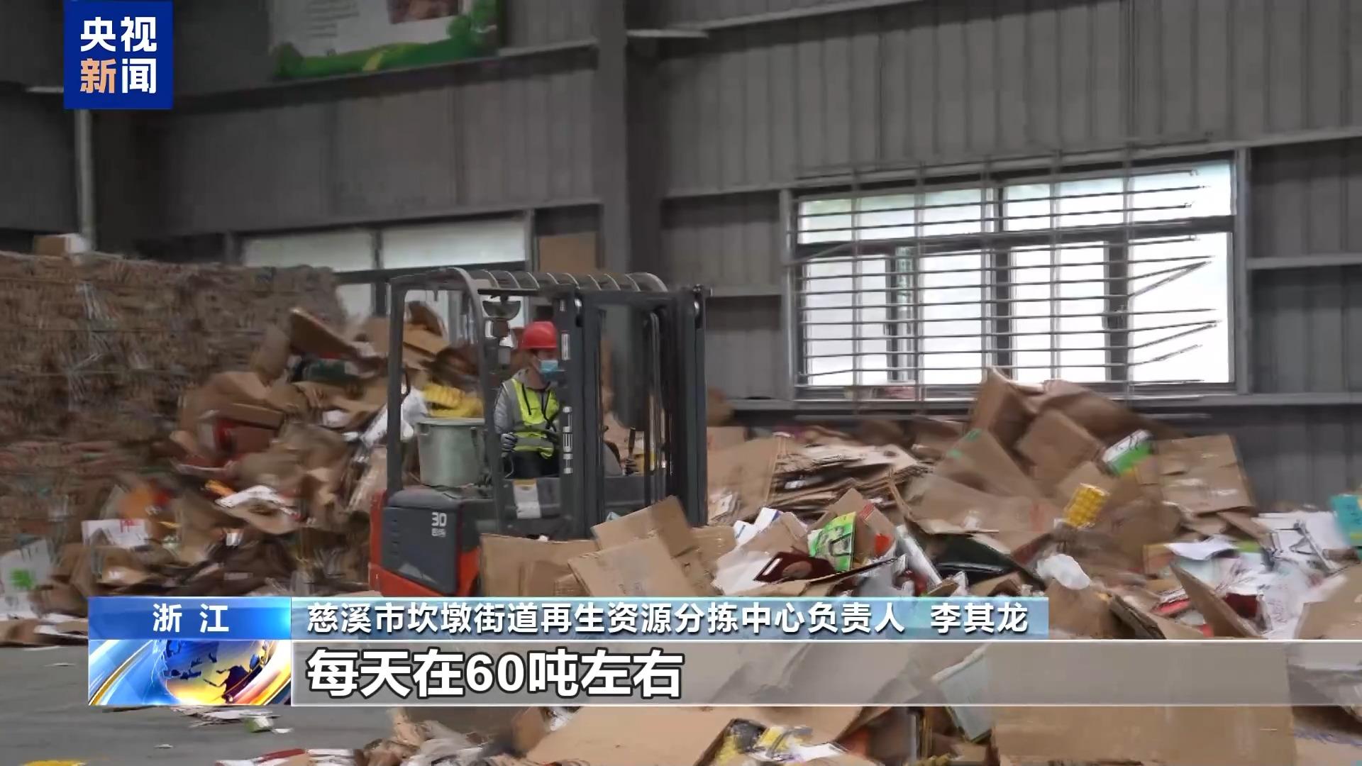 慈溪市坎墩街道再生资源分拣中心负责人 李其龙:快递包装盒回收量,比上月增加20%左右。每天在60吨左右,每天晚上7到8个人在加班处理。