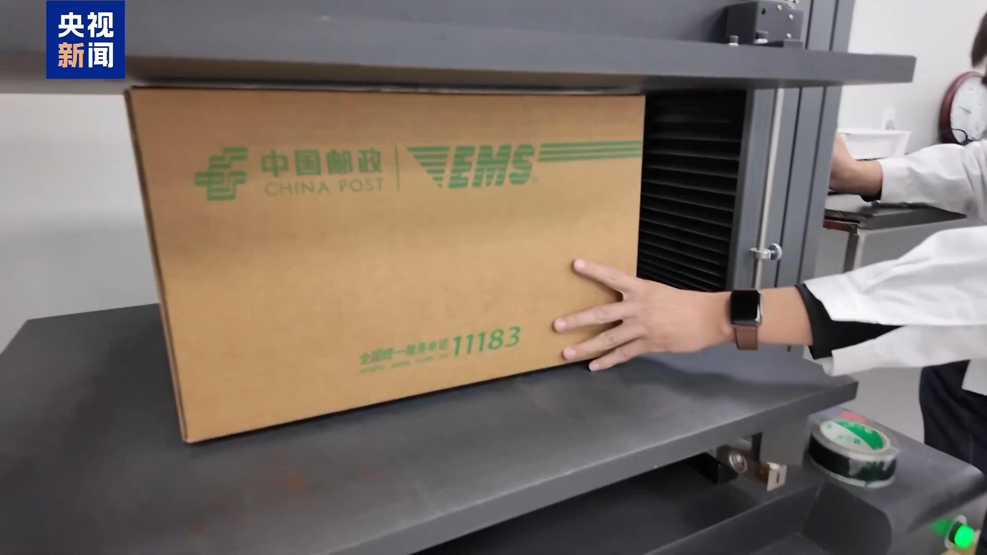 中国邮政绿色包装创新实验室包装工程师 杜兴丹:通过科学配纸,在保证纸箱耐破、抗压等核心性能的同时,最大程度减少克重,比如现在这款纸箱,比传统纸箱降低了10%到25%的克重。