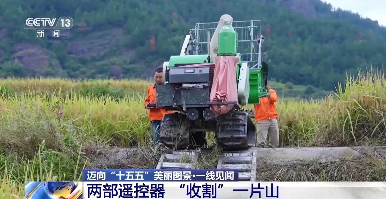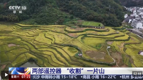 总台央视记者 陈博:缙云县是典型的“八山一水一分田”的山区县,为了种植开垦了很多梯田,有的是凹在山谷里的,有的是依山而建的,以前像这样秋收的时候,这一小层的梯田就需要一个三口之家花上一整天的时间去完成,田块的位置越高,花费的力气越大,而现在你看,一整个山头的收获,都在被遥控器所完成。