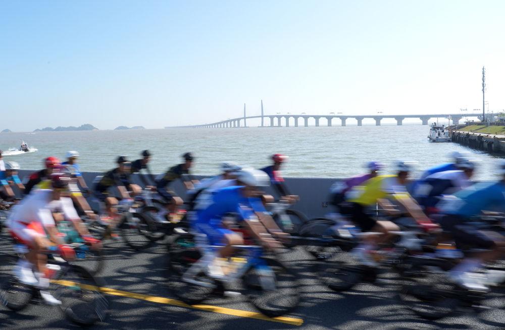 ↑11月8日,参赛选手在公路自行车男子个人赛中。新华社记者 颜麟蕴 摄