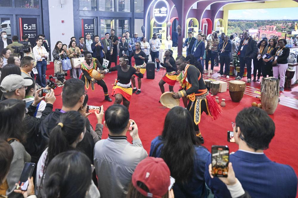 11月7日,乌干达表演者在第八届进博会国家展跳舞。新华社记者 陈浩明 摄