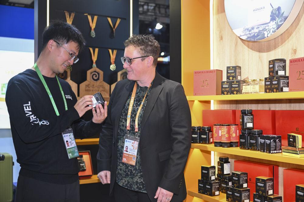 11月6日,在第八届进博会农食产品展区一家新西兰蜂蜜品牌展台,参展商(右)向观众介绍蜂蜜产品。新华社记者 陈浩明 摄