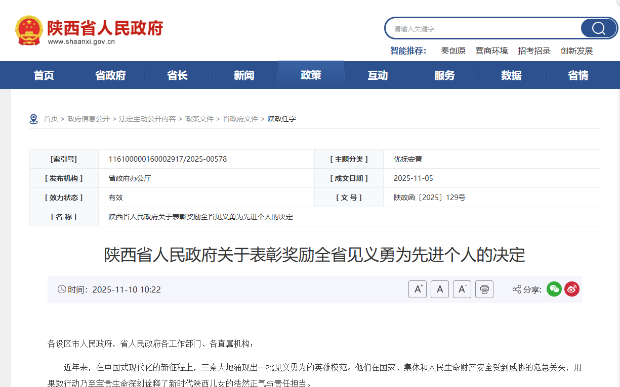 今天(11月10日)陕西省人民政府网站发布陕西省人民政府关于表彰奖励全省见义勇为先进个人的决定: