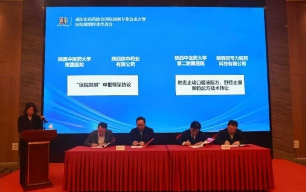 会议介绍医院制剂专委会筹备及选举结果,向陕西陕中药业有限公司授牌,为医院制剂专委会主任委员、副主任委员、首席顾问、秘书长颁发证书,医院制剂专委会主任委员表态发言。陕西中医药大学附属医院、陕西中医药大学第二附属医院、咸阳市第一人民医院、延安大学咸阳医院分别推介各自院内重点制剂。咸阳市第一人民医院、陕西中医药大学第二附属医院、咸阳肿瘤医院、陕西中医药大学附属医院分别与陕西奥晟生物科技有限公司、陕西君可力医药科技有限公司、康璞基石(陕西)健康生命科技有限公司、陕西陕中药业有限公司签订制剂申报、研发、技术转让合作协议。陕西省中医药研究院中药研究所、中国中医科学院中药研究所、康璞基石(陕西)健康生命科技有限公司分享医院制剂转化实战经验。